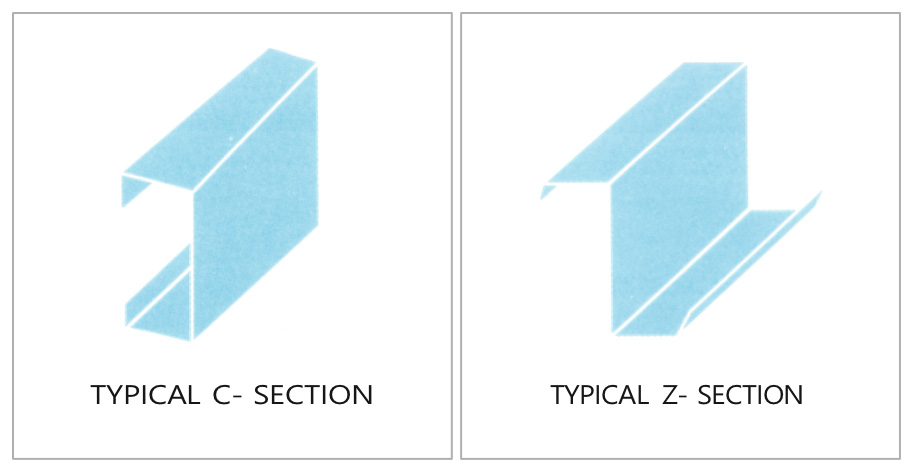- Cold- formed “Z” and “C” section to form secondary structural members (Roof Purlins, Eave and Wall Girts)